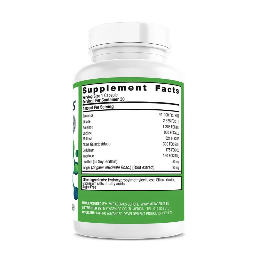 An advanced plant based enzyme formula containing a complete blend of enzymes and co-factors needed for the digestion and